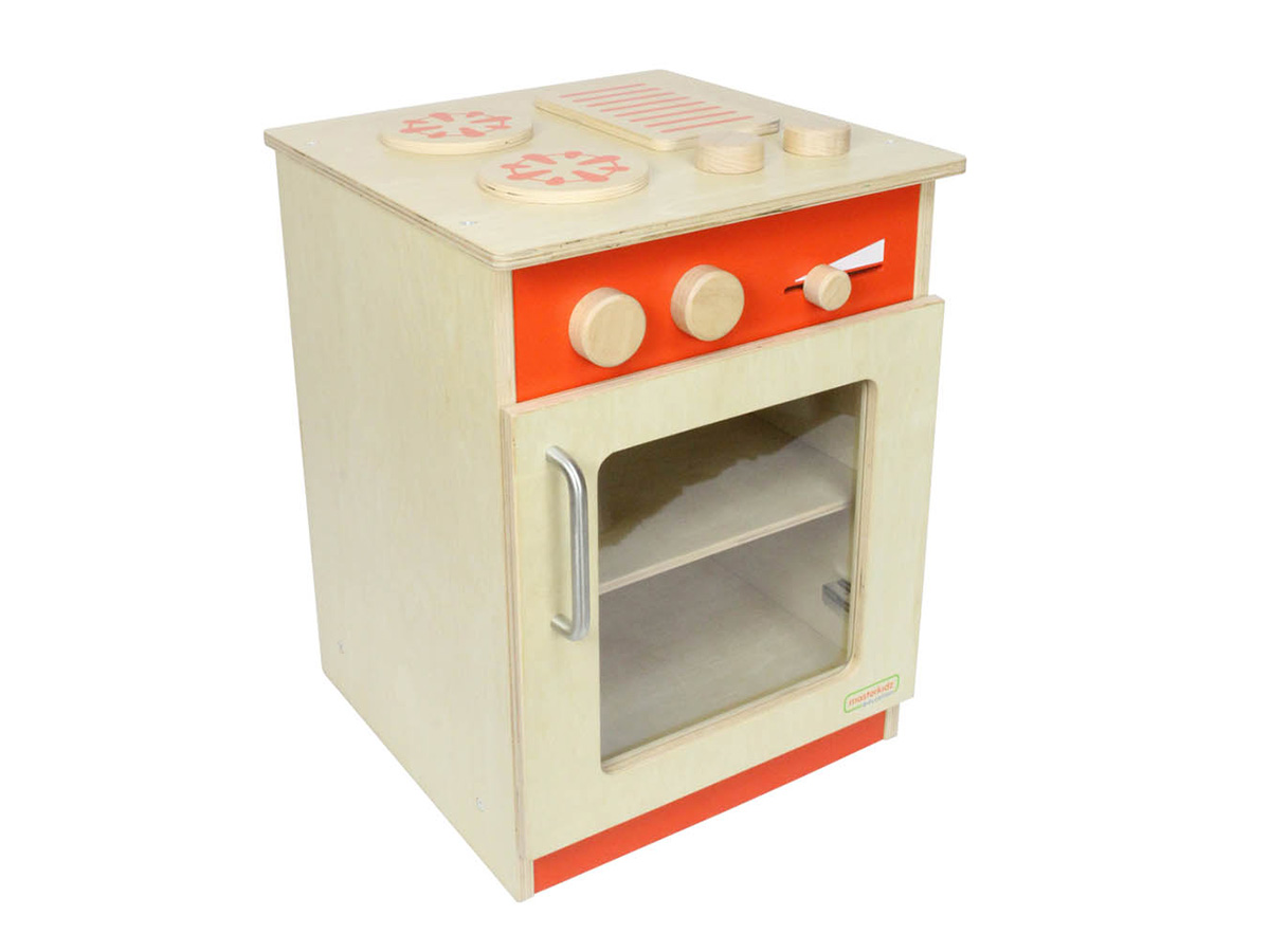 木製灶台由俄羅斯樺木合板製成,紅色凸顯出瓦斯爐的特色、四個控制旋鈕及兩層式烤箱。