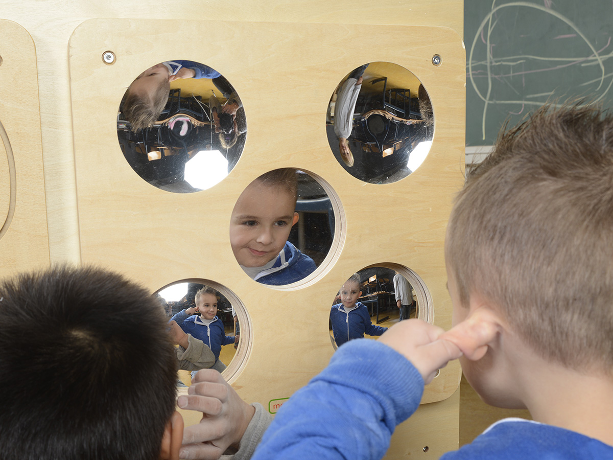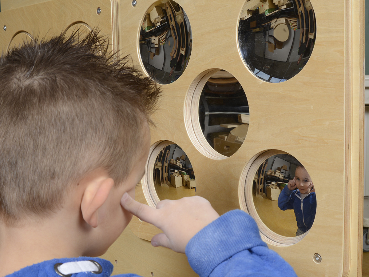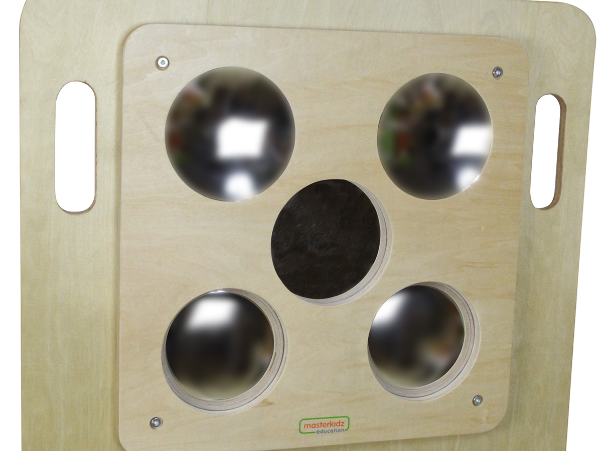 視覺探奇遊戲板包含五面圓形鏡子,其中四個 是富有趣味的凹凸鏡,中間為平面鏡。幼兒可以透 過平面鏡看到自己的樣貌、表情和動作進而與其他 四面鏡子做為對照,有利於增加幼兒自我意識和自 信心。