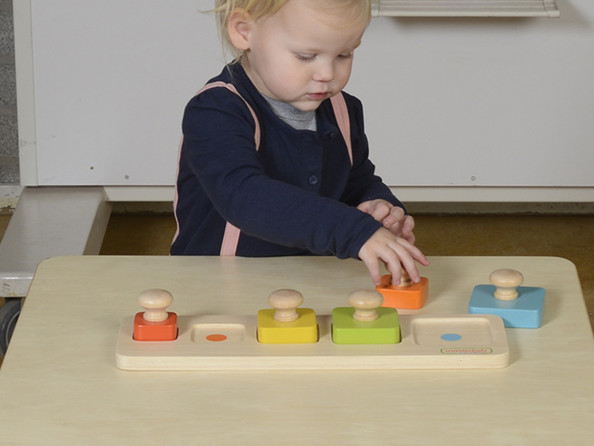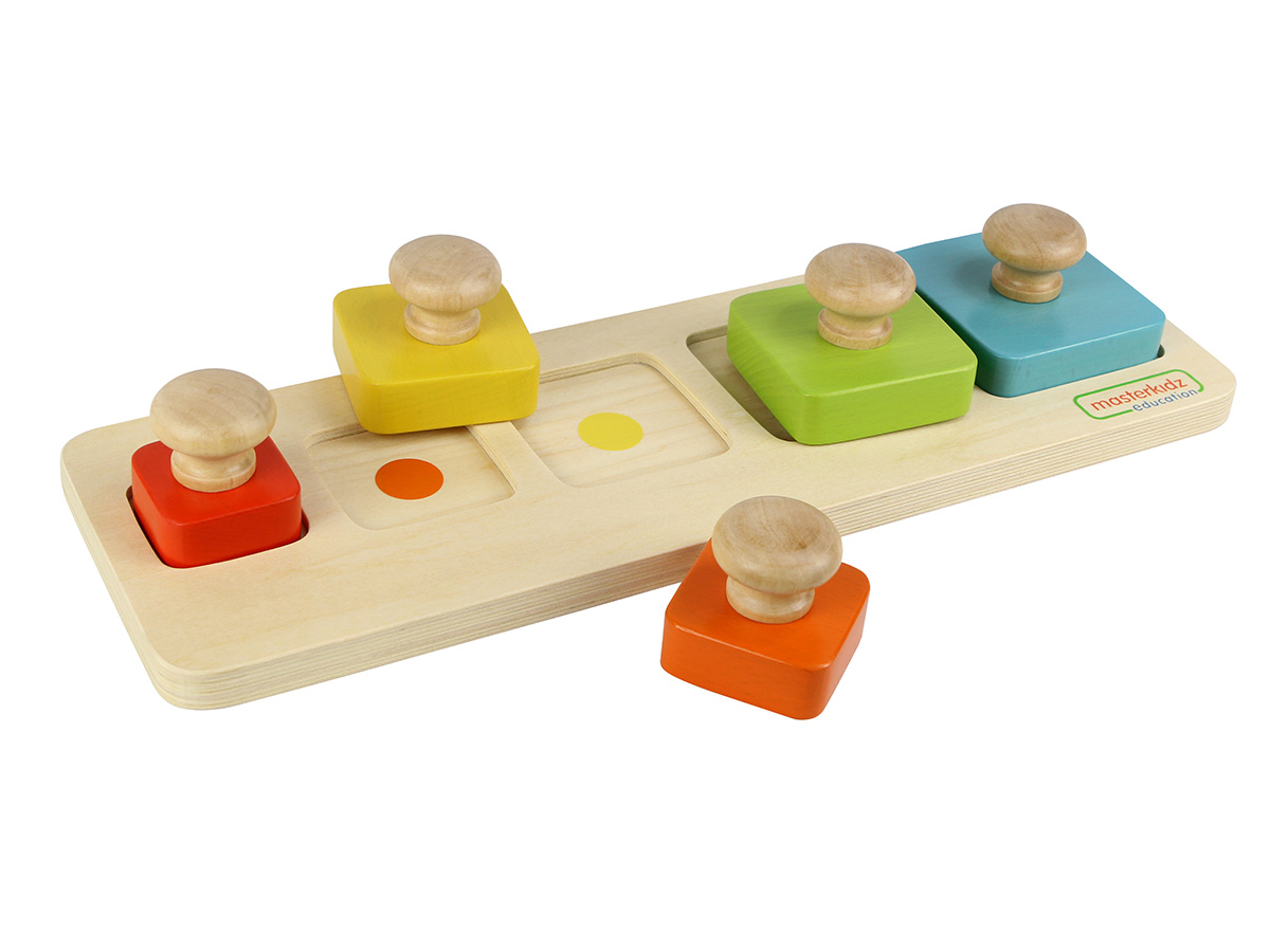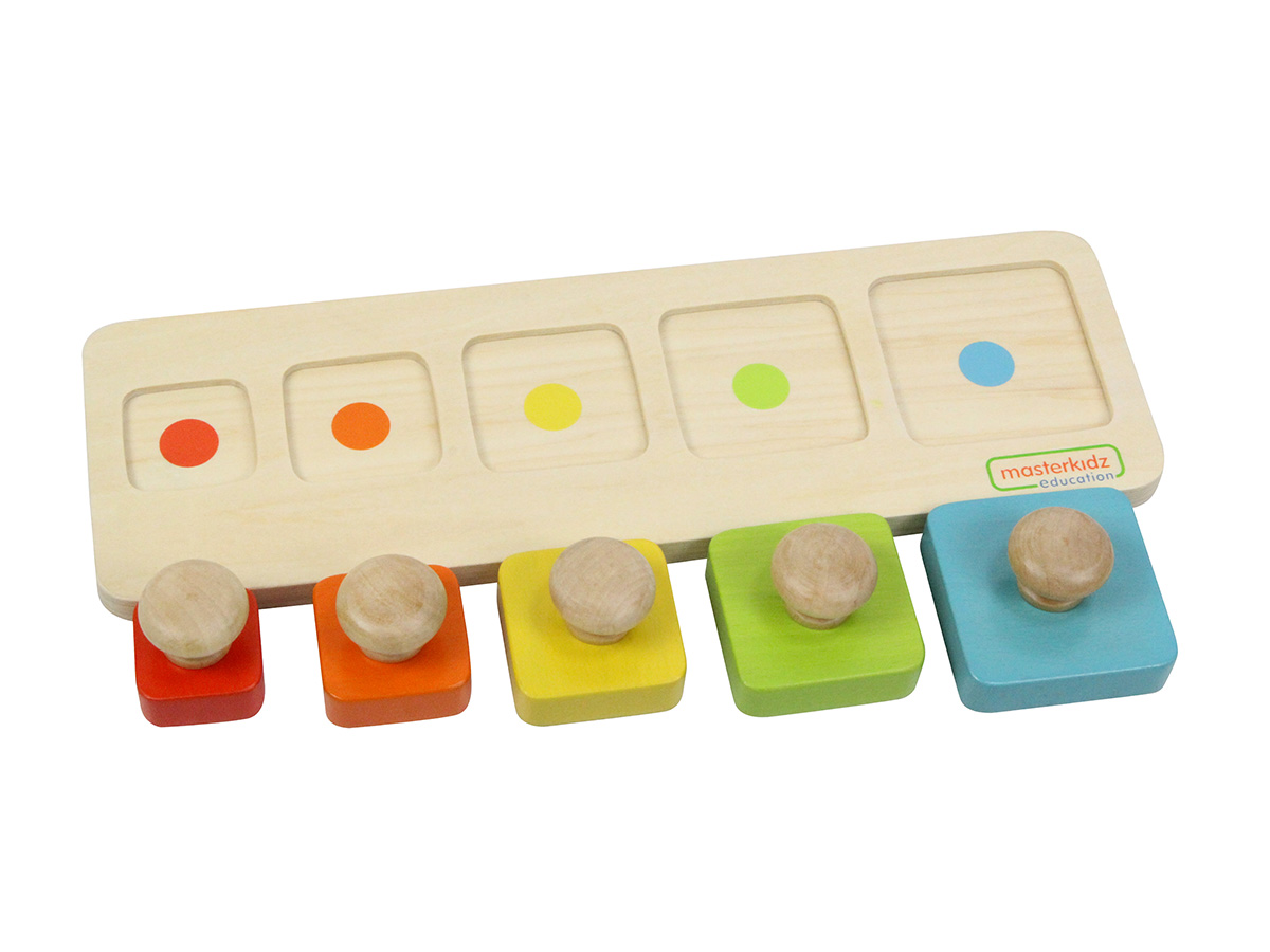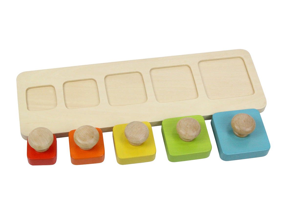 顏色大小配對學習板是由 五個正方形大小的積木,搭配 不同的顏色,讓幼兒在操作的 過程中,認識大和小,又可以 學習顏色。