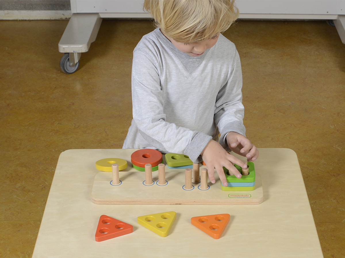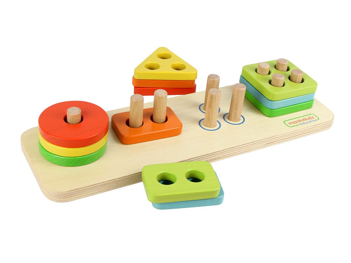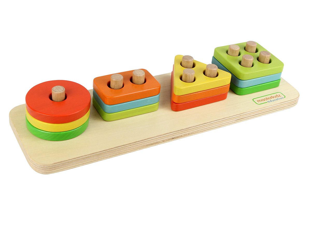 木製釘板有四種幾何圖形堆 疊組合,每種形狀有三種不同顏 色,幫助孩子發展對形狀及顏色 的觀察能力。