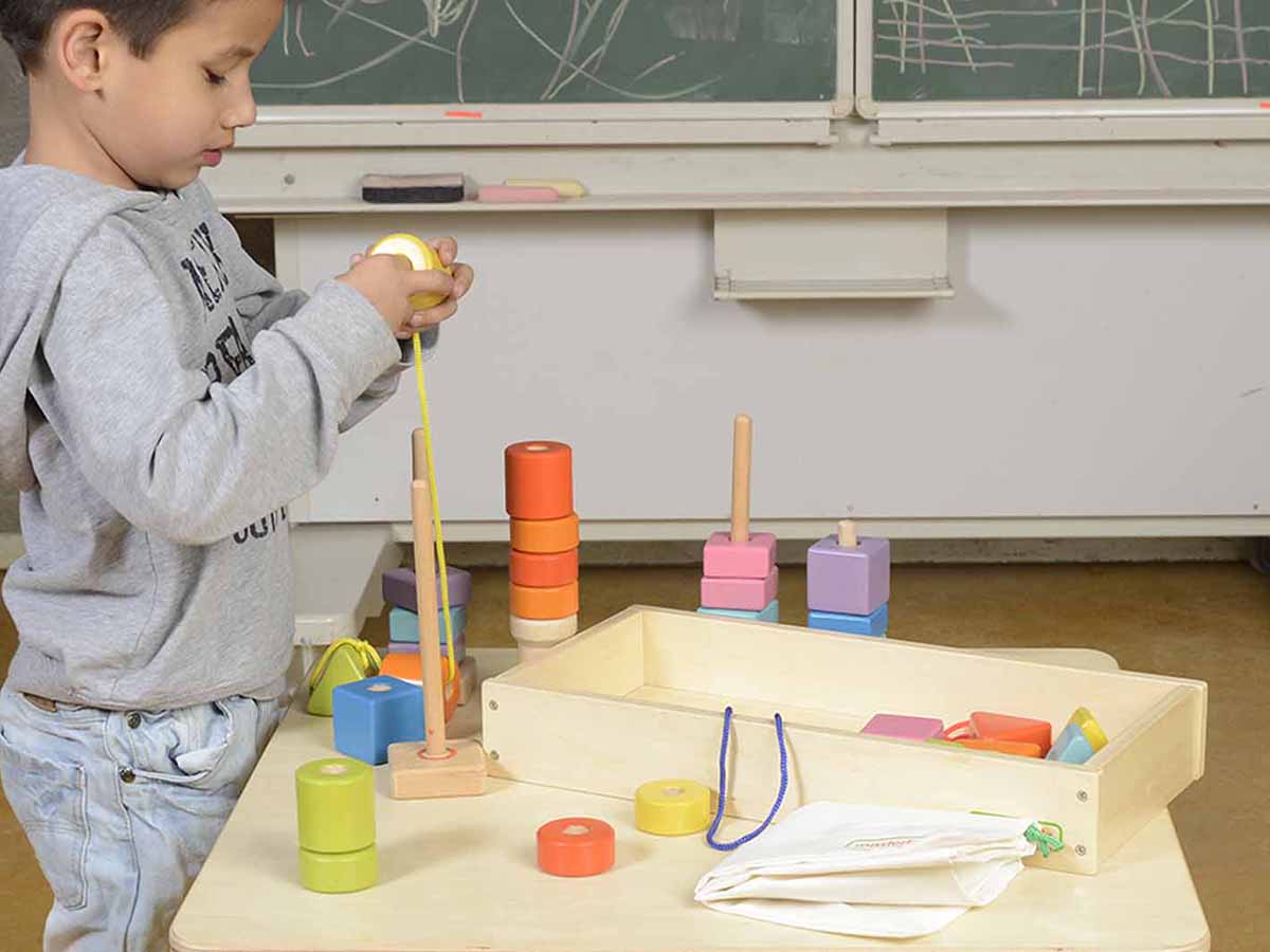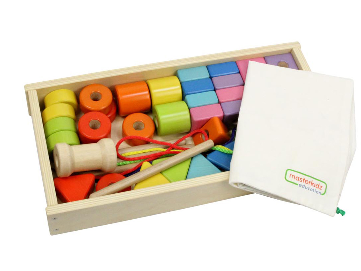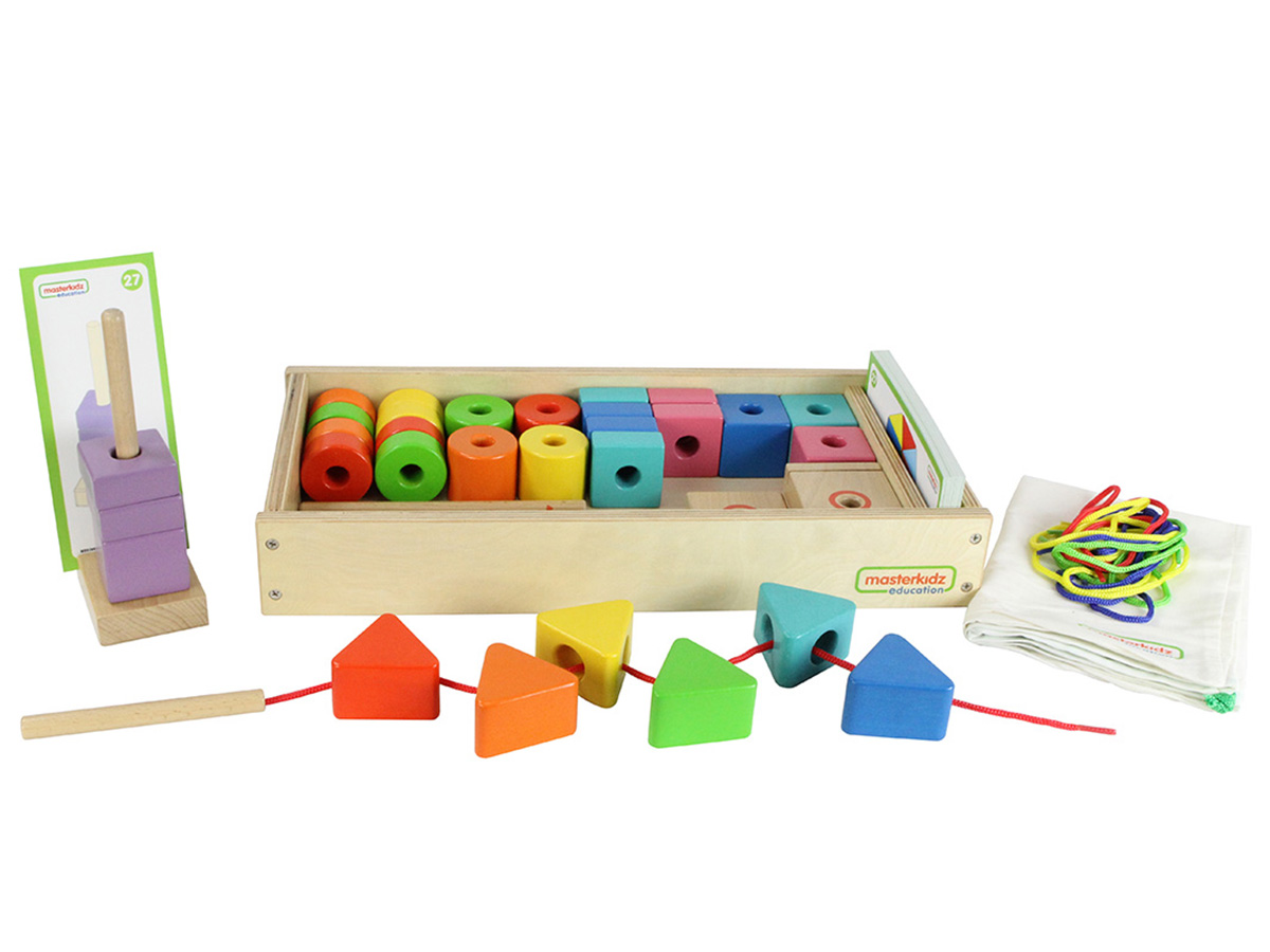本產品採用歐洲櫸木製造,外觀厚實、光滑,顏色飽 滿,顆粒大適合幼兒獨立遊戲使用。串珠遊戲(II) 包含紅、 黃、藍、綠各2 根線,4 根穿繩木棒及4 個方型底座、 4 根木柱,27 顆木珠、24 張( 雙面) 題卡及一本說明書。 本產品適用於小、中、大班,在幼兒操作遊戲過程中,能 訓練幼兒手眼協調能力及培養分數、排序認知等技能,包 含有三種不同類型的玩法: 從簡單的顏色、形狀分類到按規律推理排序的穿珠遊戲; 從數量的高矮比較到探索物體數量變化的立柱套疊活動; 從自主創意搭配運用經驗完成木珠空間的建構遊戲,使幼 兒在玩中學習、在探索中成長。