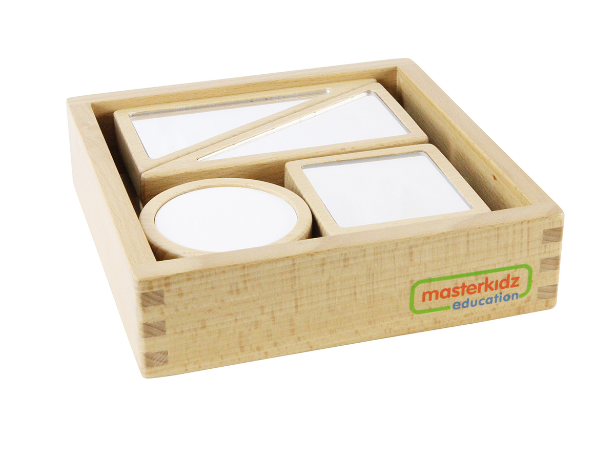 鏡面積木套裝遊不同大小和形狀的積木 組成,積木一面是鏡面、另一面是白板面, 可另購搭配鏡面遊戲盒(ME04086) 和學習 鏡面4 件套(ME04024) 進行不同的教學 遊戲,也可用於感官和空間思維訓練。本教 具包含一個收納盒,方便收納及攜帶。