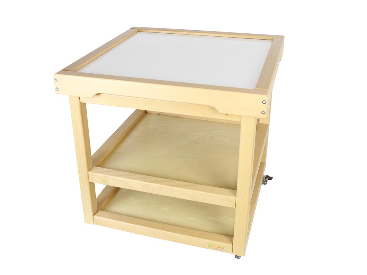 活動學習桌是由俄羅斯樺木合板及歐洲櫸木(FSC)所製成。桌面及層架式合置放MasterKidz教育系列的收納箱(ME03614、ME03584、ME03607)是一個兼具可移動、收納的桌子!