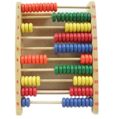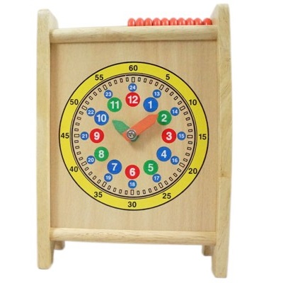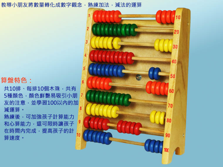 木製算盤共10 排,每排10 個木珠,共有5 種顏色,可藉由這些木珠訓練數數能力,亦可以認識時間哦。