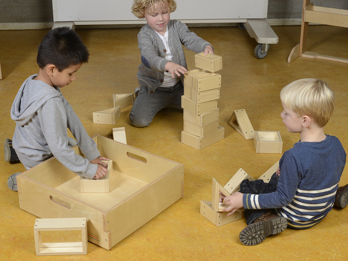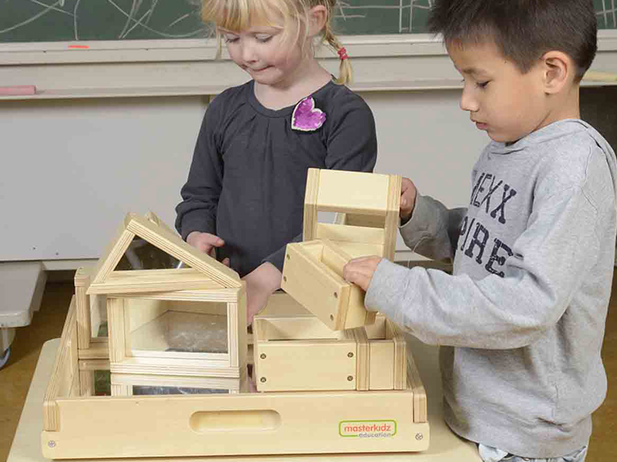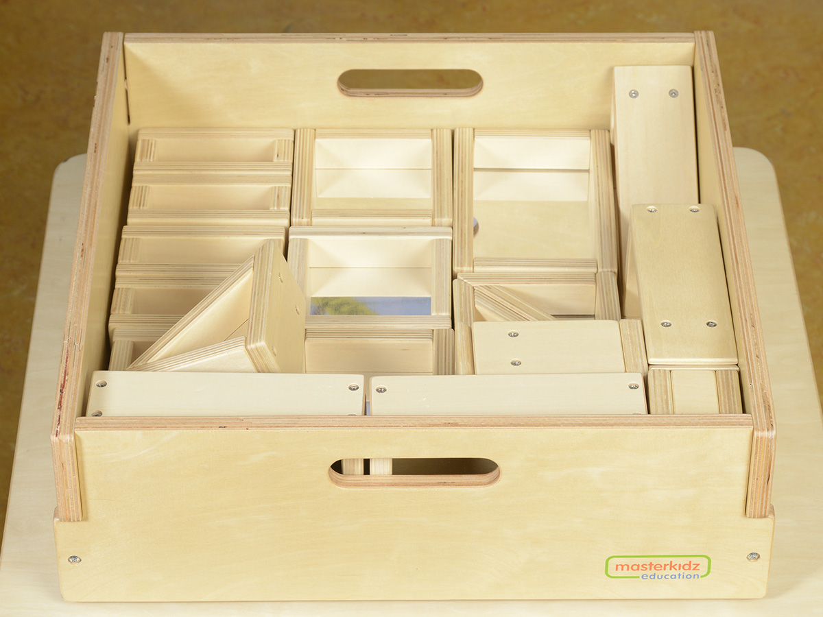 本產品採用俄羅斯進口夾板,堅固耐用, 包含31 件不同形狀的正方形、三角形和長方 形。每一塊積木都配有兩面鏡子。幼兒可以透 過積木去進行倒影探索,也可以利用鏡面的反 正區觀察。積木能發展幼兒對形狀認識,邏輯 思考能力和探索能力的發展,幼兒可以搭建屬 於自己的城堡。幼兒在建構圖型過程中,會對 圖形的特點,分割與組合產生直覺式的認識。