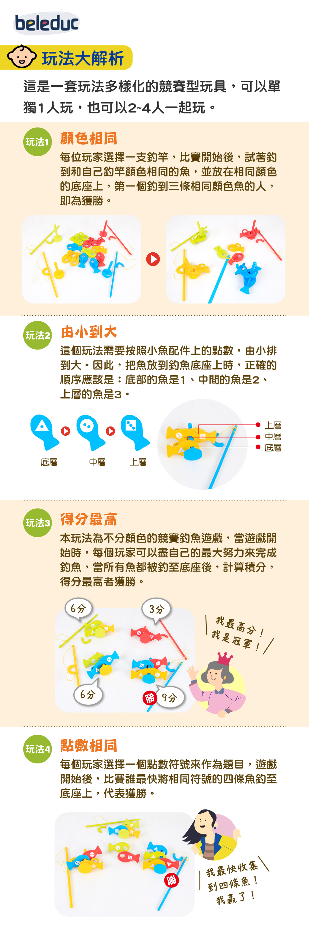 遊戲介紹:準備好了,一起去釣魚吧!誰能釣到3條相同顏色的魚並放在同一個釣魚底座上呢?釣魚遊戲有多種玩法,魚的底部有點數。 "